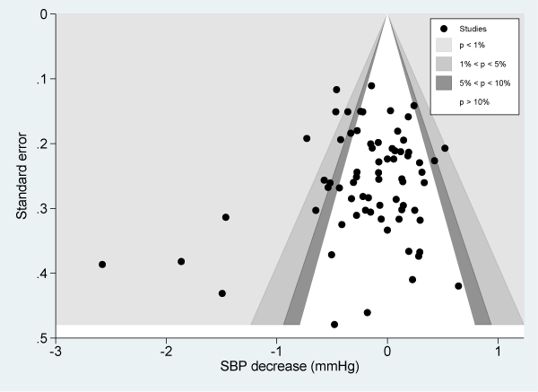The graphical representation of possible publication bias is shown in Figure 5. It can be seen in the funnel plot that a majority distribution of studies are around the mean estimation; the point of 4 papers are relatively far from the central point cloud, with estimations that show greater reductions in systolic BP (between -2,6 and -1,5 mmHg); on the other hand, no works were seen with similar estimations on the other side of the point cloud. Instead, calculating unpublished studies by the method of Glesser Olkin (Table C, Appendix) shows a negative result (i.e., probably there is no non-identified study to discover). Figure E (Appendix) shows a weighted line of effects in large and small studies, suggesting that there is not an effect of small studies.