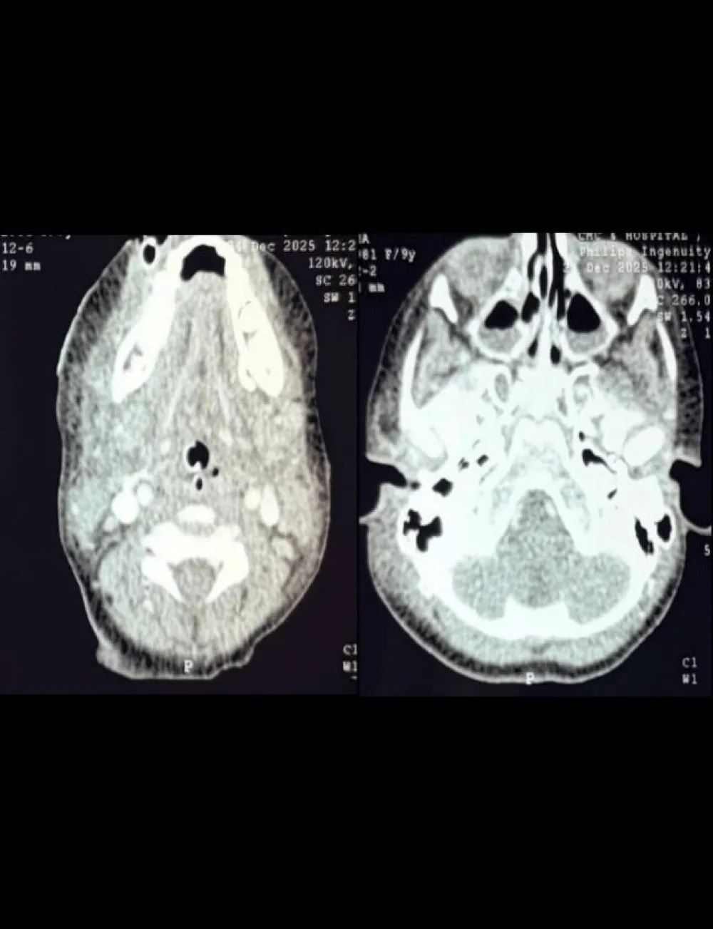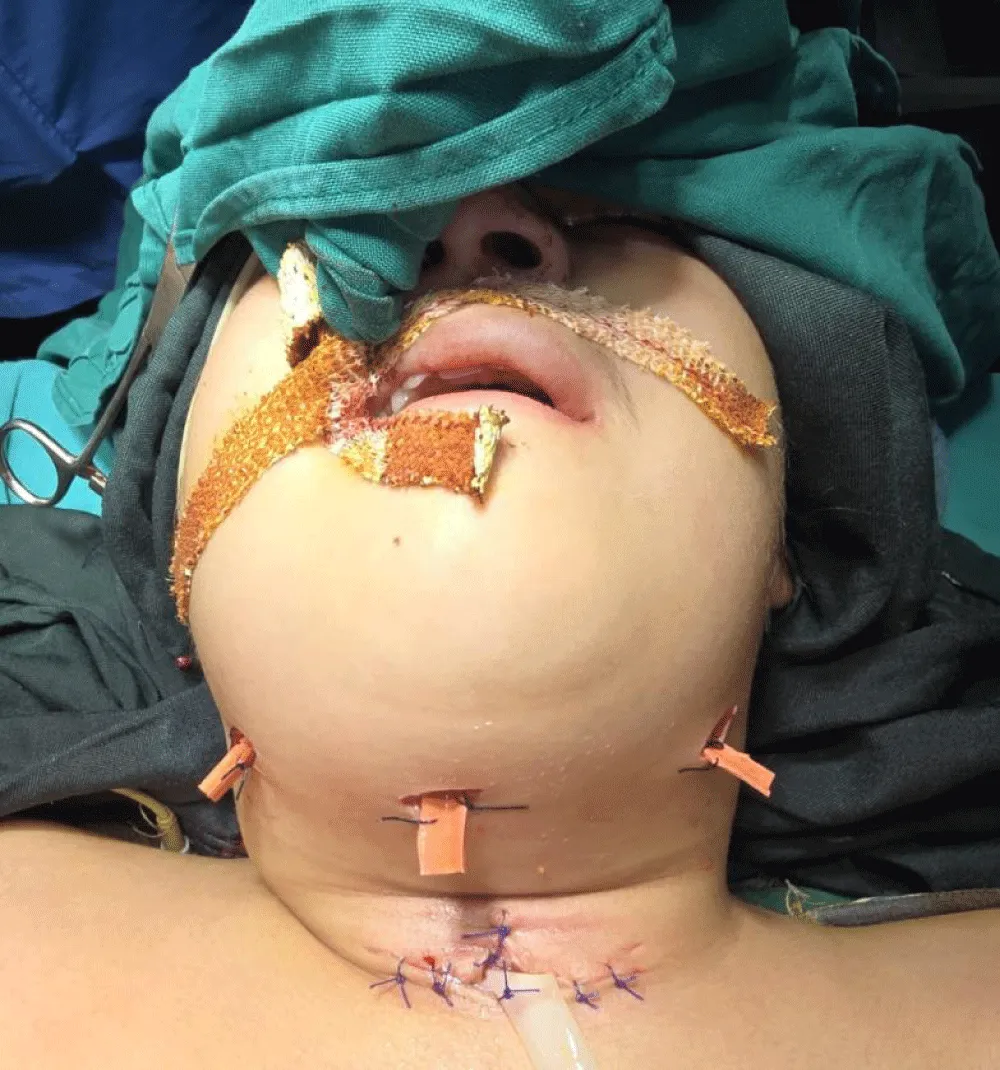 Saturation was maintained around 80%, and the pediatric surgery team was called for emergency tracheostomy. An 18-gauge needle was introduced after feeling the trachea, and pus came out through the needle. A small horizontal incision was made, from which a gush of pus was drained. About 80 cc of pus was drained from the anterior neck space. Further exploration was done, and the trachea and esophagus were inflamed but could not be identified, so laryngoscopy was attempted again—the tip of the epiglottis was viewed, and an uncuffed endotracheal tube of size 4.5 was inserted blindly after seeing the bubble below the tip of the epiglottis, following which the airway was secured. Saturation had increased to 100%. She was kept on spontaneous respiration for the rest of the surgery with intermittent low doses of ketamine (5 mg) and sevoflurane with oxygen. Intraoperatively, 50 cc of pus was drained from the right submandibular space and 3 cc from the submental space, and a corrugated rubber drain was placed. Postoperatively, the patient was shifted to the ICU with stable vitals, unextubated, for further management. On post-op day 1, she was managed with sedation on pressure support mode. IV antibiotics, chest physiotherapy, and nebulizations were continued for another 3 days. She was extubated on the 3rd postoperative day. Her vitals were stable, awake, and she was breathing adequately. She was shifted to the ward, and she was discharged the next day in a stable condition (Figure 1).