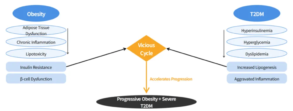 Obesity and T2DM share common risk factors including unhealthy lifestyle (high-calorie diet, physical inactivity), genetic susceptibility, aging and environmental factors [5]. However, the relationship between them is far more complex than co-occurrence: epidemiological studies have confirmed that obesity, especially central obesity characterized by visceral adipose tissue (VAT) accumulation, is the strongest independent risk factor for T2DM; individuals with a body mass index (BMI) >30 kg/m² have a 5-10 times higher risk of developing T2DM than those with normal BMI [6]. Conversely, T2DM is also an independent risk factor for weight gain and adipose tissue dysfunction: insulin resistance and hyperinsulinemia in T2DM patients lead to abnormal fat synthesis and distribution, further exacerbating obesity [7]. This bidirectional interplay forms a vicious cycle that accelerates the progression of both diseases and increases the difficulty of clinical management.