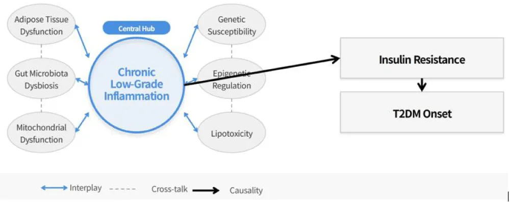 Obesity and T2DM are two closely linked global metabolic diseases with a complex bidirectional interplay: obesity is the primary driver of insulin resistance and pancreatic β-cell dysfunction, the core pathological features of T2DM; while T2DM-induced metabolic disorders further exacerbate adipose tissue dysfunction and abnormal fat metabolism, forming a vicious cycle that promotes the progression of both diseases. Chronic low-grade inflammation, adipose tissue dysfunction, gut microbiota dysbiosis, mitochondrial dysfunction and genetic epigenetic regulation are the key interrelated pathogenic mechanisms linking obesity and T2DM, forming a complex regulatory network.