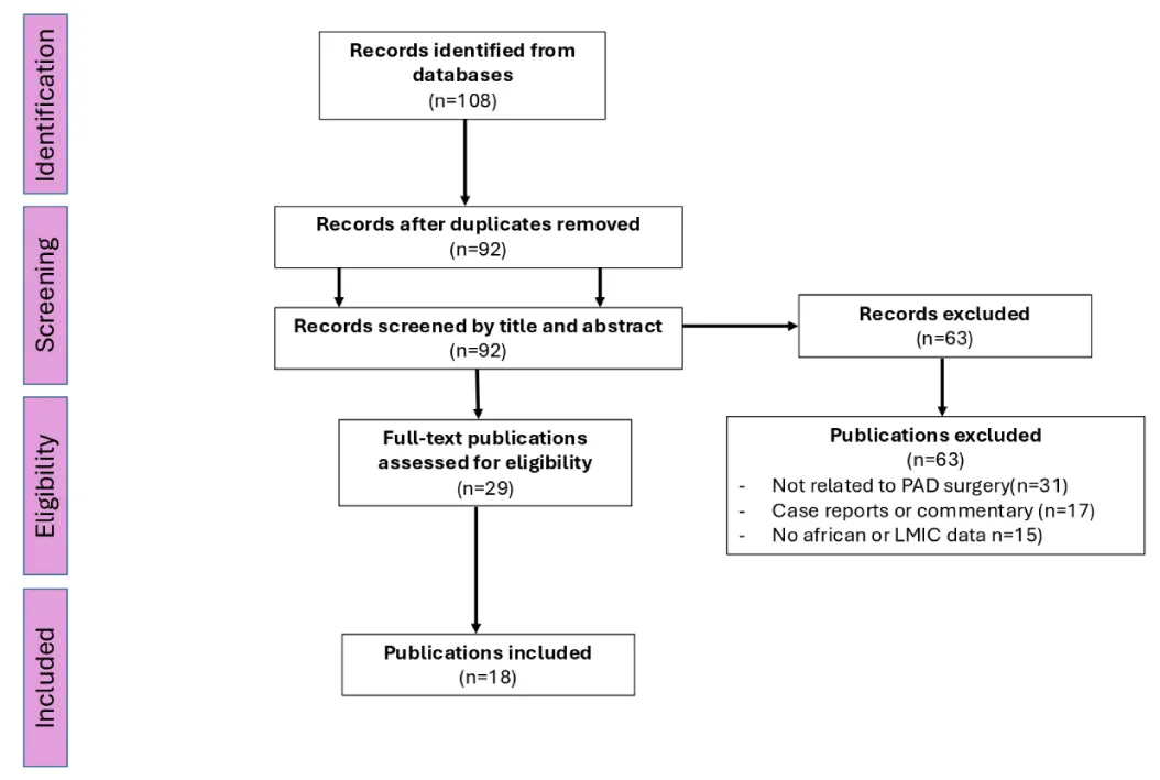 A narrative literature review was conducted following PRISMA principles. Electronic databases, including PubMed/MEDLINE, Scopus, and African Journals Online, were searched for studies reporting the surgical management of PAD in Africa and other LMICs. Search terms included combinations of “peripheral arterial disease,” “critical limb ischemia,” “vascular surgery,” “revascularization,” “amputation,” and “Africa.” Titles and abstracts were screened, and relevant studies were reviewed in full text according to predefined eligibility criteria (Figure 1).