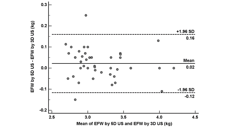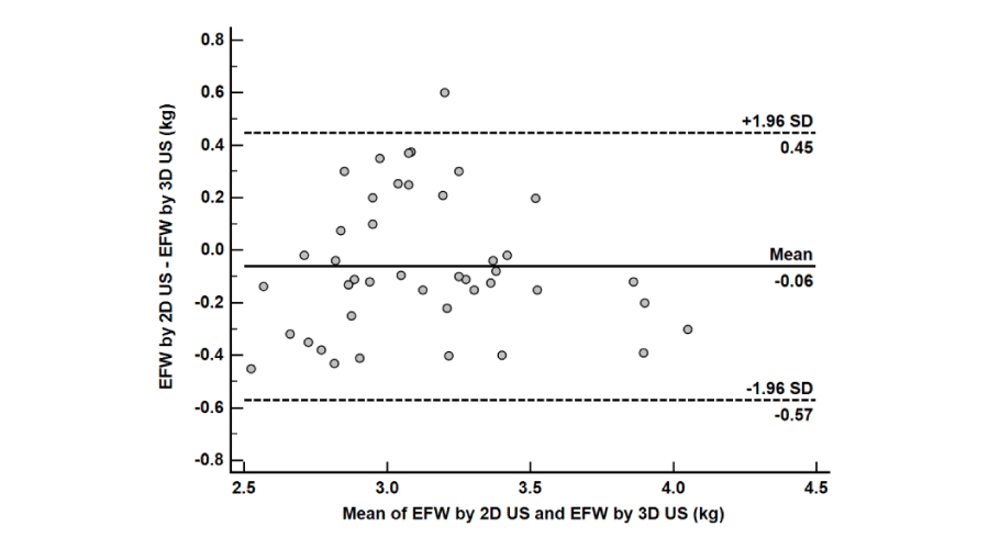 Data were analyzed using MedCalc© Statistical Software version 15.8 (MedCalc© Software bvba, Ostend, Belgium, 2015). Continuous numerical variables were presented as mean ± SD and categorical variables as number (%) or ratio. Accuracy of 2D, 3D or 5D US for estimation of birth weight was assessed by calculation of the standard error of the estimate. The accuracy and precision of different techniques were alternatively assessed by calculation of the systematic error and random error respectively for the signed and absolute error as well as for the signed and absolute percentage error. The accuracy of the different techniques was compared by running the paired Student t test on the estimated mean error (systematic error) for each assessment tool. The precision was compared by running the Pitman t test [10], on the variance of the error of each technique. The Bland-Altman [11], method was used to examine inter-method agreement. A two-sided p-value <0.05 was considered statistically significant.