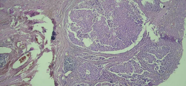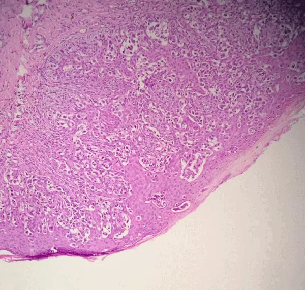 A 62-years old female was in natural menopause for 14 years. She was referred to oncology department of Ghaem hospital, Mashhad University of Medical Sciences in July 2016. She suffered of painful vulvar lesion with severe purities for 4 years. In examination, an erythematous and exfoliated lesion of the right major and minor labia extend to anus was detected. It also extended up to the clitoris, but did not invade to external urethral meatus. She had history of using recurrent topical corticosteroid. The result of the biopsy was PDV with full-thickness involvement (Figure 1). In investigations, she had persistent hematuria. Screened for any associated underlying malignancies including breast examination, mammography, pelvic and abdominal ultrasonography, colonoscopy, and chest X-ray were normal. Pelvic CT scan was revealed irregularity of the posterior wall of the bladder. Results of cystoscopy biopsy determined low-grade urothelial carcinoma (Figure 2). As an associated malignancy, she underwent successful radical cystectomy. In addition, treatment proposed for the vulvar lesion topical imiquimod 5% cream to be applied every other day after confirming of bladder carcinoma. After 6 weeks of therapy, the patient is free of disease and now is under serial follow-up.