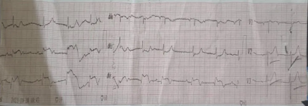 At NCC, reassessment revealed significant hemodynamic deterioration. Vital signs were as follows: blood pressure 80/50 mmHg, heart rate 40 beats/min, and temperature 37 °C. Electrocardiography was performed (Figure 2). Bedside transthoracic echocardiography demonstrated normal left-sided cardiac structure with preserved left ventricular systolic function, no resting regional wall-motion abnormalities, and no mitral regurgitation. No mechanical complications were identified, including ventricular septal rupture, free-wall rupture, or papillary muscle dysfunction. However, the right ventricle was dilated with global hypokinesia.