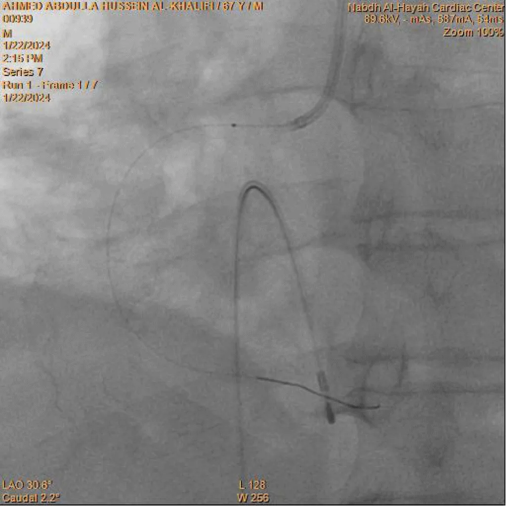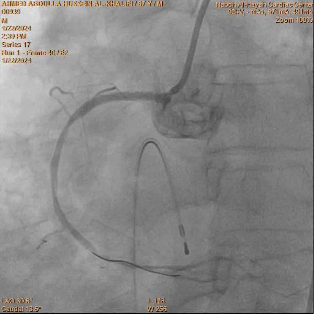 The entire system, including the guiding catheter, both BMW PTCA guidewires, the balloon, and the fractured aspiration catheter tip, was removed en bloc. The guiding catheter was flushed with heparinized saline, and the retrieved broken catheter tip was clearly identified. The RCA was subsequently re-engaged using a new JR 3.5 guiding catheter, and a fresh BMW PTCA guidewire successfully crossed the proximal RCA lesion. Predilatation was performed using a 2.0 × 12 mm Sprinter balloon, restoring TIMI III flow. A 3.0 × 30 mm drug-eluting stent was then deployed in the proximal RCA and inflated to 14 atm. Final angiography demonstrated TIMI III flow with good stent expansion and no evidence of edge dissection (Figure 6).