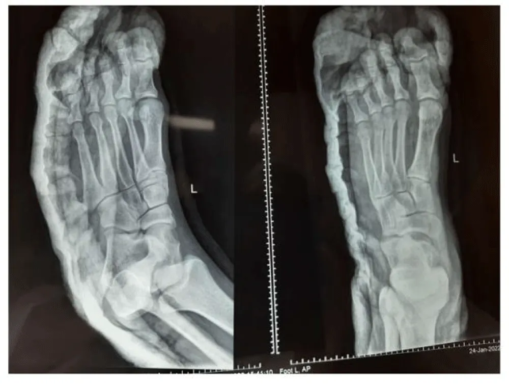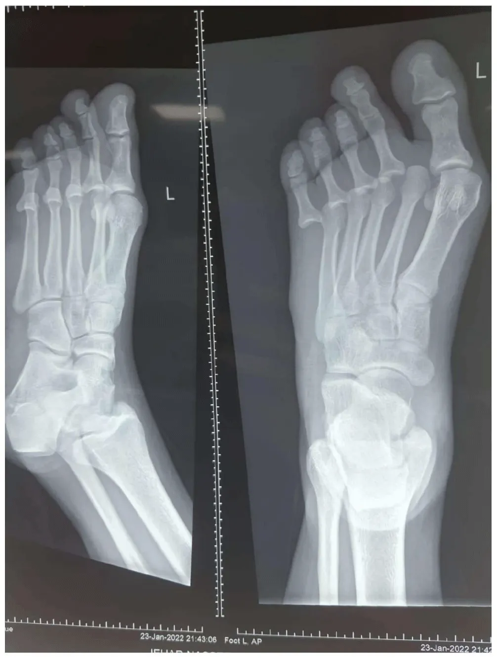 Closed simultaneous dislocation of MTP joints are very unique and rare injury [1], which, if not managed in time, can have a detrimental effect on the patient’s weight bearing and gait in the future. Metatarsophalangeal joints (MTP) are synovial condyloid-type joints. They are important in the formation of the transverse arch of the foot, the terminal stance and pre-swing phase of the gait cycle and for flexion and extension of toes [2]. Anatomically, the stability of MTP joints is due to deep transverse metatarsal ligaments and the plantar plate, which is a dense fibrous thickening of the plantar capsule. The joints are relatively unprotected on the dorsal side, making dorsal dislocation more common. There are some reports of isolated dislocation of a single MTP joint described in literature [3-5] along with very few reports of all five MTP joints dislocations [6-8], all of which were treated by open reduction with Kirschner wire fixation. Only one case of traumatic dorsal dislocation of all five MTP joints to date has been described in the literature, which was treated successfully by closed reduction [9].