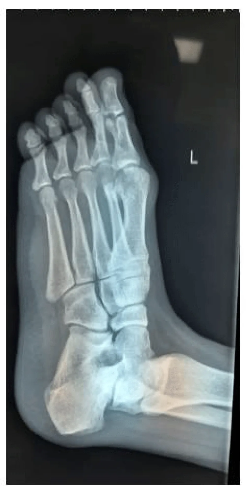 A 32-year-old male patient with no medical co-morbidity was brought to the emergency department of our hospital late at night following a motor vehicle accident with main complaints of trauma to the left foot and ankle, which was swollen with deformity of the lesser toes with associated painful attempted movements. Distal foot vascularity was intact with intact neurology. The medial aspect of the ankle was swollen with tenderness around the medial malleolus. Radiographs of the injured foot and ankle revealed dorsoradial dislocation of the lesser four toes at MTP joints with a unicortical crack seen in the ipsilateral medial malleolus (Figure 1).