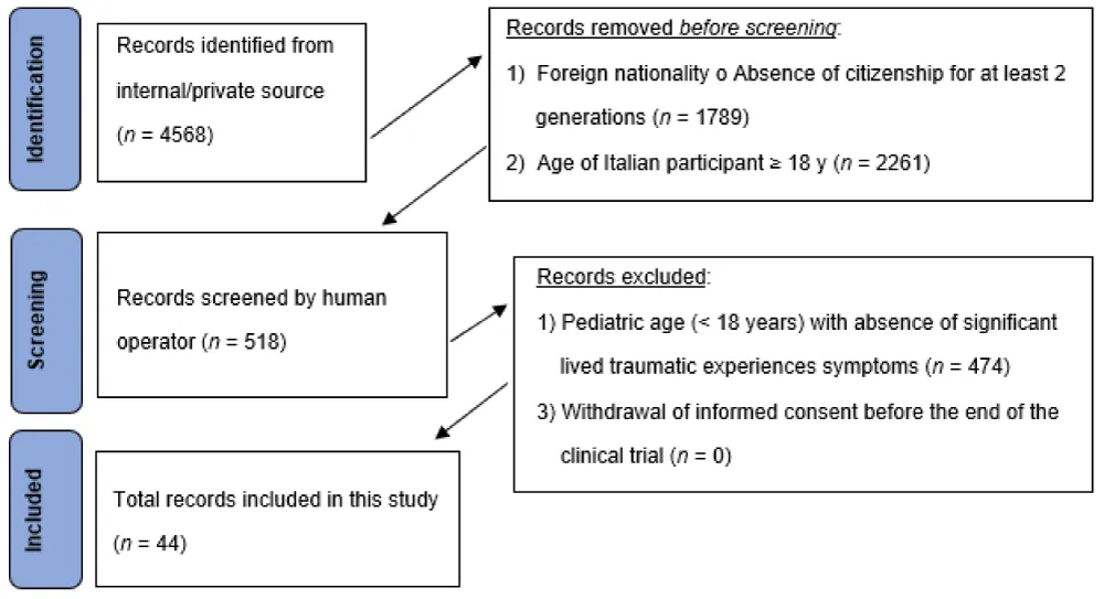 The selected population was divided into 2 groups: the first (clinical group, CG) and the second (control group, CG). Inclusive criteria for CG are: 1) Age 8-17 years old; 2) Italian nationality or citizenship for at least 2 generations; and 3) narrative of one or more unresolved youthful traumatic experiences (occurring by the time they reached the age of majority, 18 years old). Exclusive criteria for CG are: 1) Age < 8 years and ≥ 18 years old; 2) foreign nationality or Italian nationality for less than 2 generations; 3) Absence of unresolved youth traumatic experiences. The sample of the CG is 44 units. All individuals with the same characteristics but with the absence of youthful traumatic experiences, regardless of their resolution, were included in the CG. For organizational reasons, Cg’s sample is also 44 units, comparable to each other in age and gender (Figure 2).