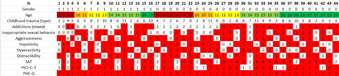 During the clinical interview, the therapist took note of the personal and family clinical history, sexual gender, age, type of childhood trauma not processed correctly (not treated in psychotherapy or through psychopharmacological administration), the presence of an addiction to substances or behaviour, the presence of inappropriate sexual behaviour, aggression, impulsivity, hyperactivity, distractibility, educational difficulties and socio-relational difficulties (Table 4), correlating them individually and in a series of multiple regressions with the data of the 3 questionnaires, the SAT for attachment, the PICI-C-3 for identifying the dysfunctional personality profile and the PHEQ to study emotional intelligence. In the following table, the descriptive details of possible childhood traumas are not processed correctly. It was not possible to integrate the study with health data on the genetic investigation, as none of the selected subjects had this information available.